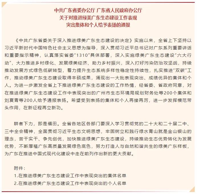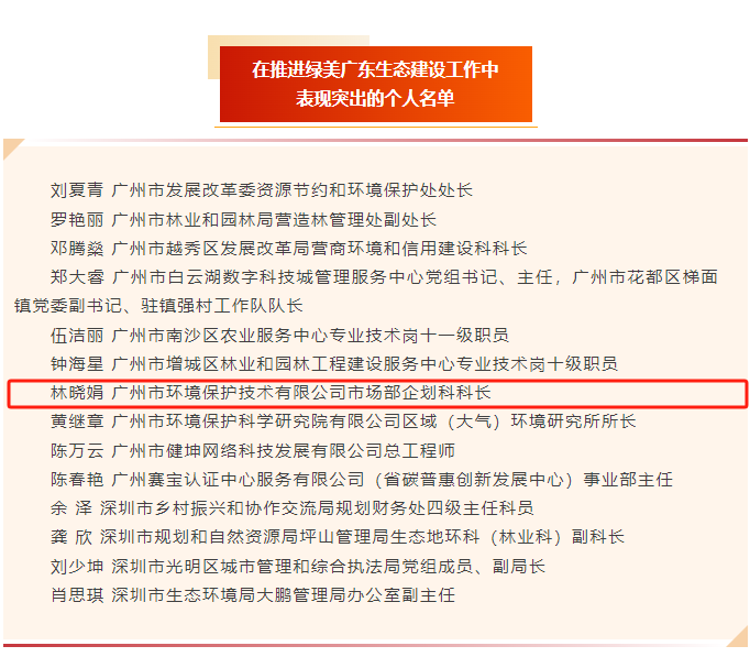 近日,中共廣東省委辦公廳、廣東省人民政府辦公廳對(duì)在推進(jìn)綠美廣東生態(tài)建設(shè)工作中表現(xiàn)突出的200個(gè)集體和200人給予通報(bào)表揚(yáng),我司市場(chǎng)部企劃科科長(zhǎng)林曉娟榮獲“推進(jìn)綠美廣東生態(tài)建設(shè)工作表現(xiàn)突出個(gè)人”榮譽(yù)稱號(hào)。這一殊榮不僅是對(duì)林曉娟個(gè)人專業(yè)能力和辛勤付出的高度認(rèn)可,更是對(duì)環(huán)保技術(shù)公司在綠美廣東建設(shè)領(lǐng)域深耕不輟,助力打好污染防治攻堅(jiān)戰(zhàn)的充分肯定。