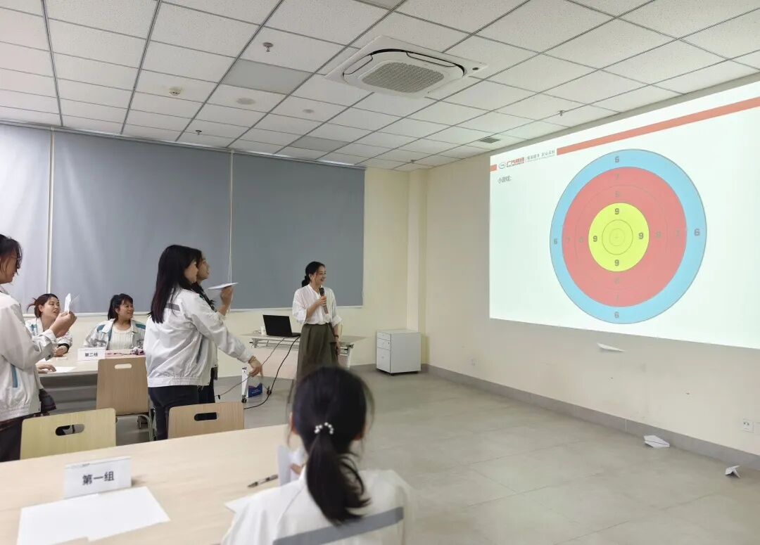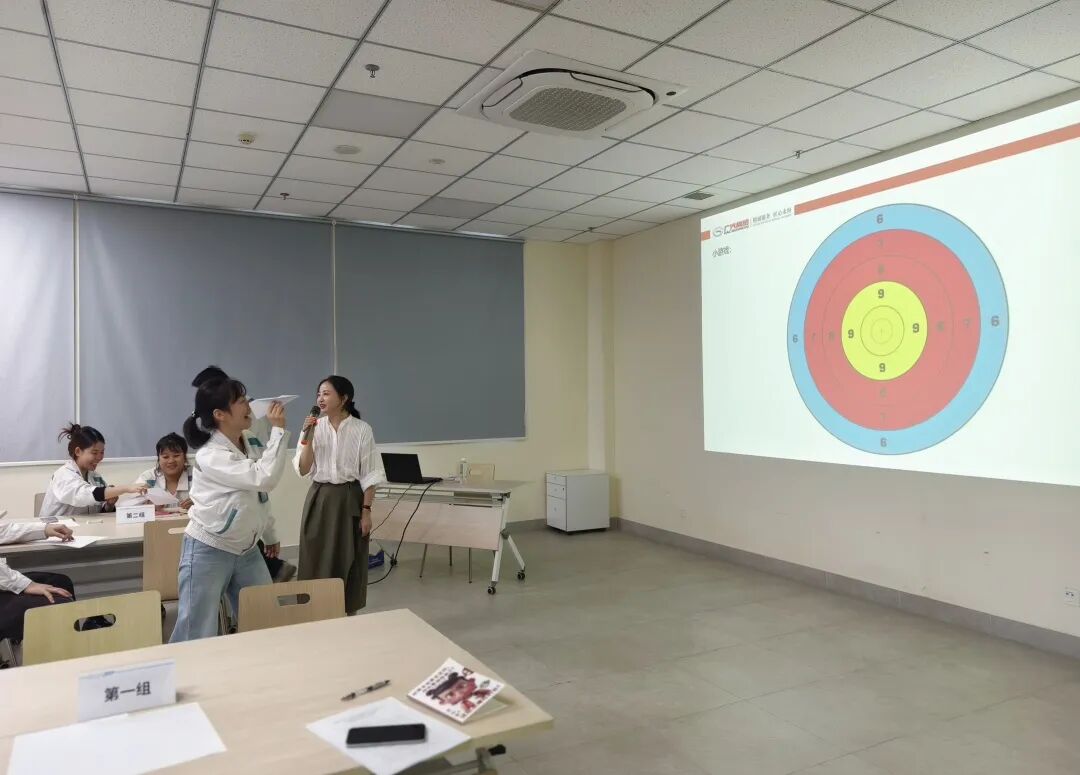 在“放飛煩惱”環(huán)節(jié),每位學員認真寫下三個近期困擾自己的壓力事件,將紙條折成紙飛機,共同飛向屏幕上的靶心,象征釋放負擔、直面挑戰(zhàn)。張老師巧妙運用“打氣球”比喻壓力積累過程,深入淺出地講解了壓力過載時的身心表現,幫助學員識別并正視自身壓力狀態(tài)。在交流分享環(huán)節(jié)中,學員們積極發(fā)言,分享了通過唱歌、向親友傾訴、享受美食等方式進行自我調適的經驗。