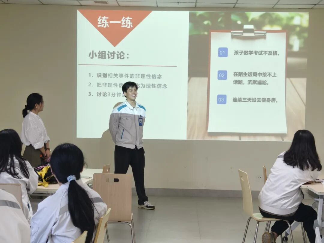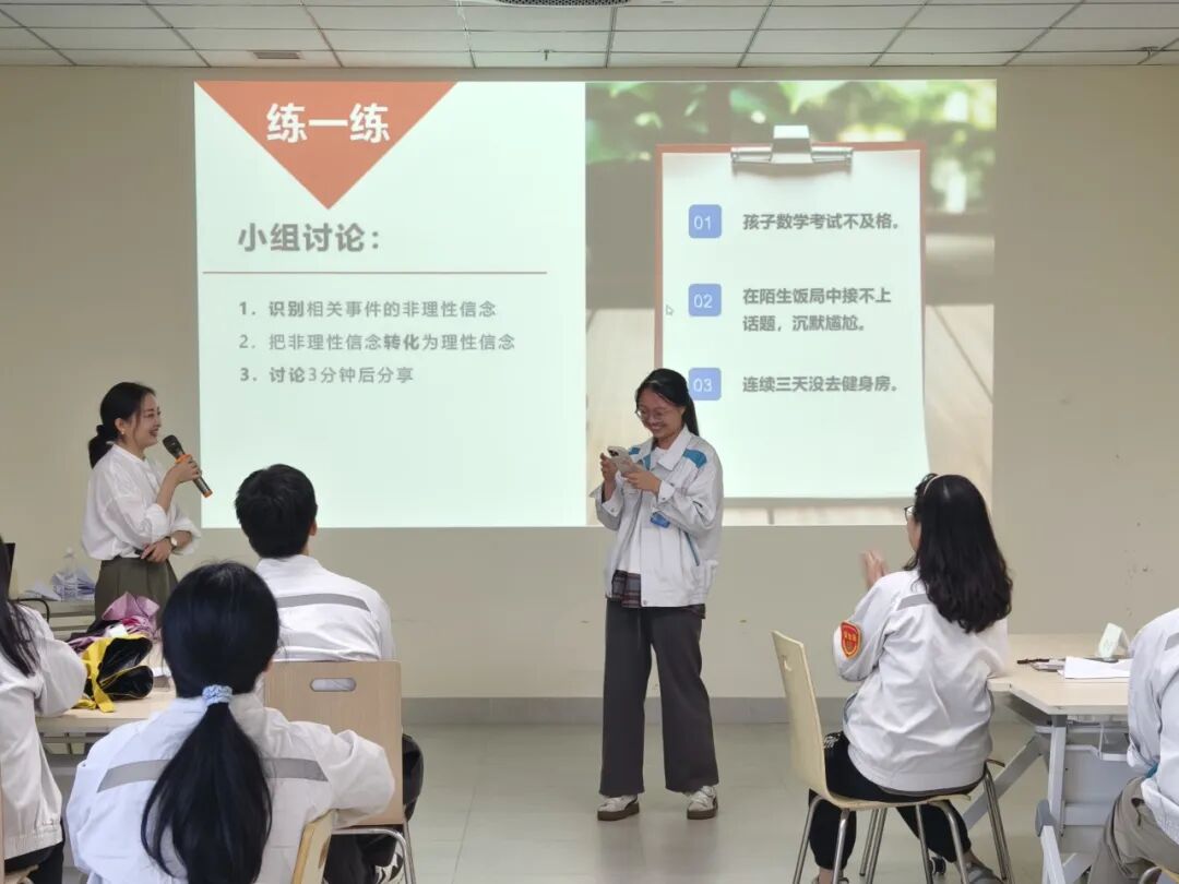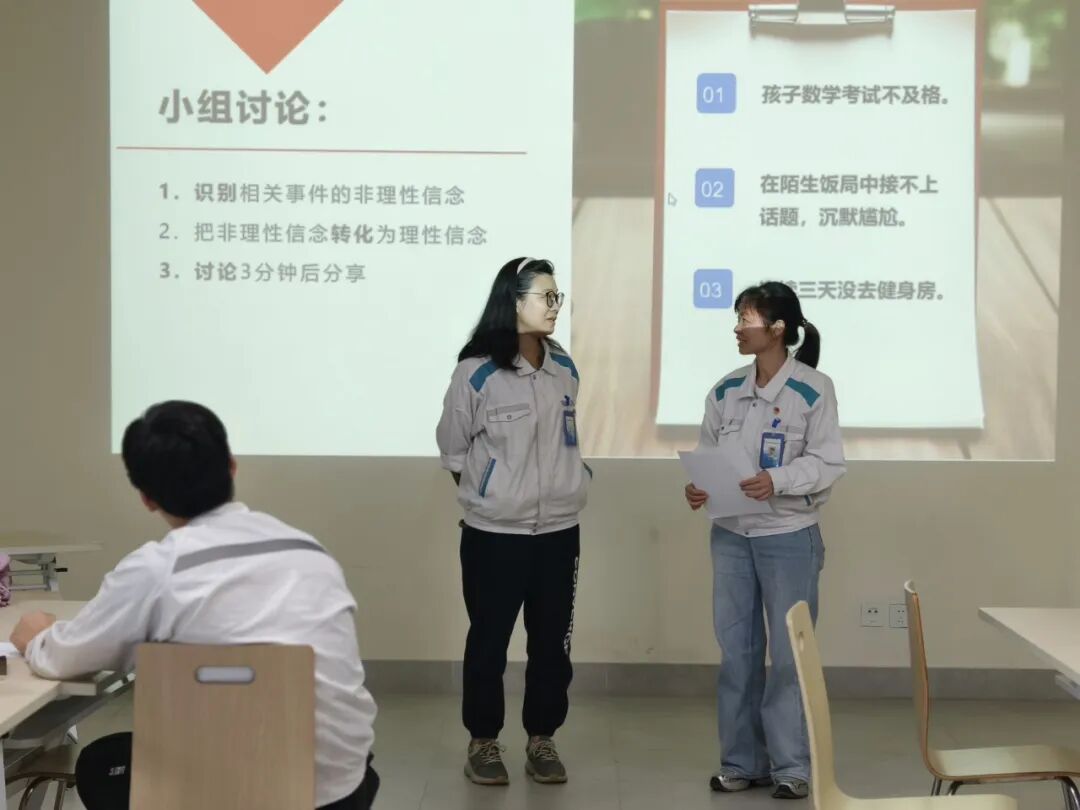 在認知調節(jié)教學中,張老師引入“情緒ABC理論”,引導學員認識到:影響我們情緒和行為的并非事件本身,而是我們對事件的看法。學員們分組圍繞“非理性信念”展開討論,練習如何將其轉化為理性信念,提升應對壓力的能力。